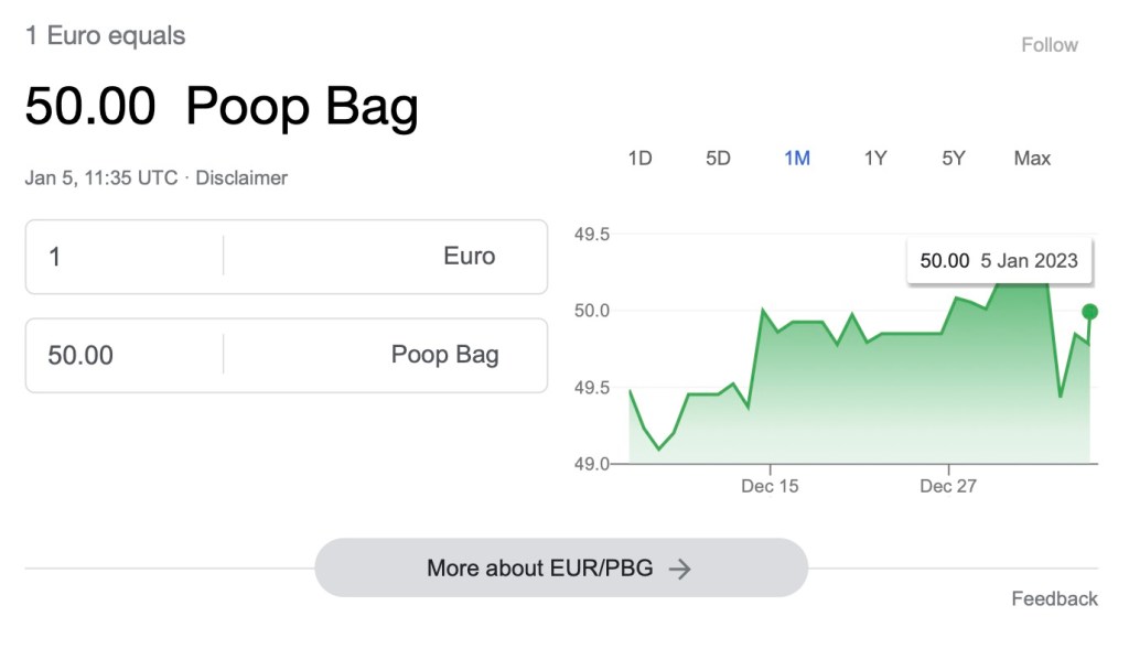 At a park not far from my house, the city has put up a sign stating that you need to pick up after your dog or risk a fine of 50 EUR. (Or, as was pointed out so helpfully, about the same cost as 2500 poop bags, thereby giving poop bags about the same buying power as the Dominican Peso, the Ethiopian Birr, the Macedonian Denar, or the Mauritius Rupee, among others.) And, just so you get the message, the exact same sign is repeated no less than five times every five meters or so. But, strangely enough, despite the universality of the warning and fine, the sign is not present in any other park in Not-Bielefeld that I’ve been too, suggesting that the job order to “just put up these six signs” was given at the very end of someone’s working day.