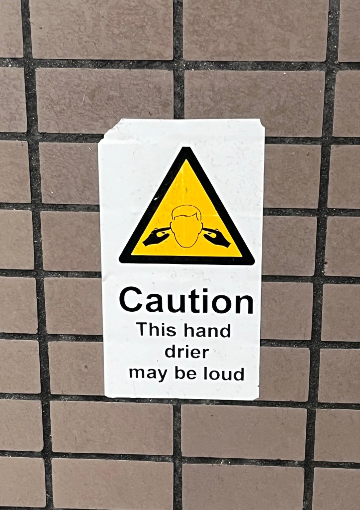 … the photo on the right is “courtesy” of Belfast International Airport and immediately begs two important questions. First, given that we’re not taking about paper towels here, who doesn’t already know this? (Or, said otherwise, is this sign at all necessary?) Second, how can anyone possibly dry their hands when their fingers are sticking in their ears? As such, instead of the warning, instructions might have been more helpful. And, wouldn’t another warning about hot air blowing on your head maybe have been more appropriate? Or simply about the air possibly being reasonably hot? (And that’s “reasonably” in both a normal, day-to-day sense as well as in a idiotic, legal sense a la all the McDonald’s coffee lawsuits.) And blind people? Completely screwed. Absolutely no chance for them to shield their more acute hearing before they dry their hands.